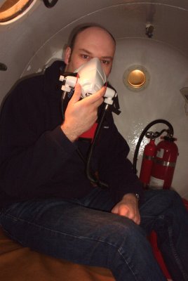 When you get treated in the Recompression Chamber we have to supply you with 100% Oxygen. As the chamber itself is pressurised with normal air (which contains both Nitrogen and Oxygen gases), we do this via a Face Mask (these are called BIBS Masks) which supplies you with 100% Oxygen.